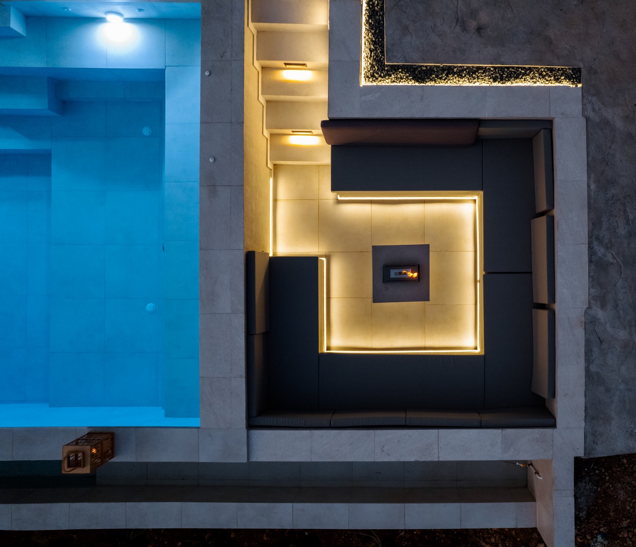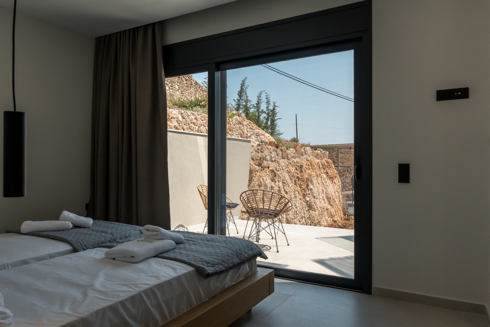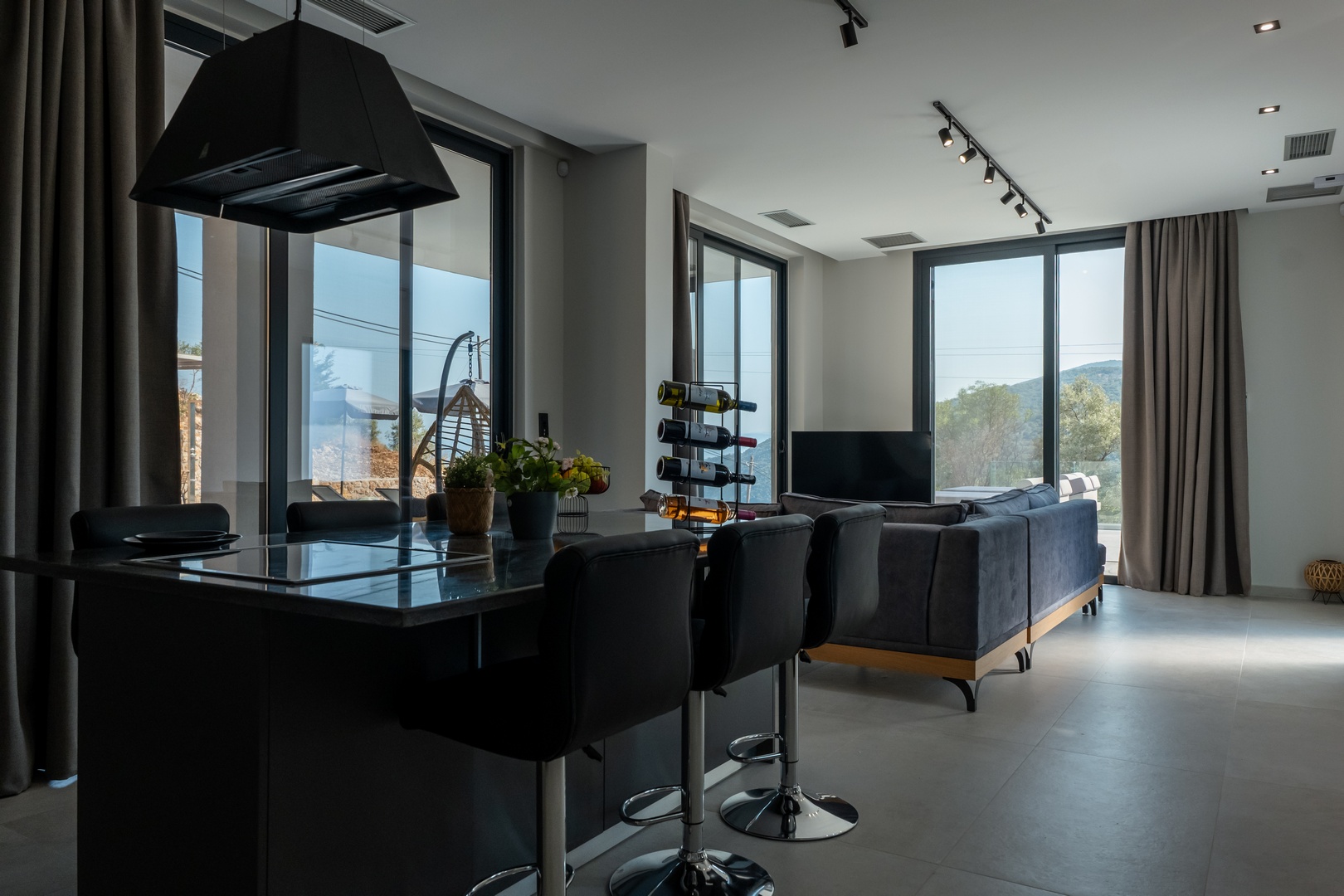 The outdoors space offers a private swimming pool, a BBQ with a dinning area, private parking, and a relaxing lounge area, all design to capture the stunning stunning vistas of the bay and the Ionian Sea.