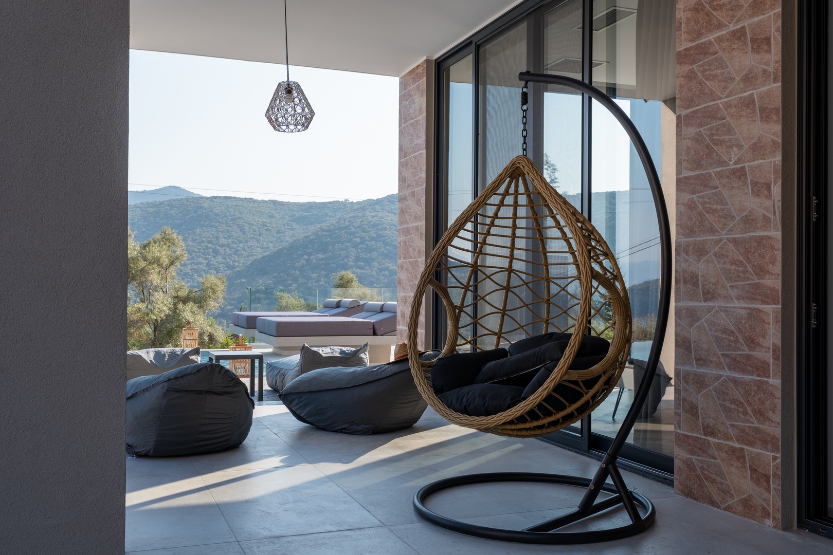 Nestled on the lush green hills of Poros in Lefkada, this magnificent modern villa seamlessly harmonized with the local landscape, offering breathtaking, panoramic views over the sparkling turquoise waters of Mikros Gialos beach.