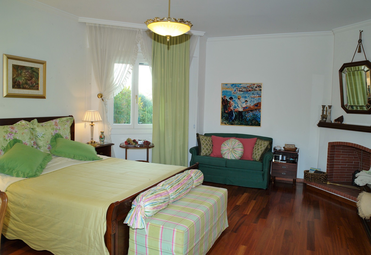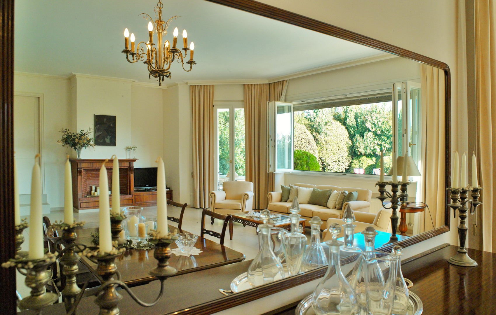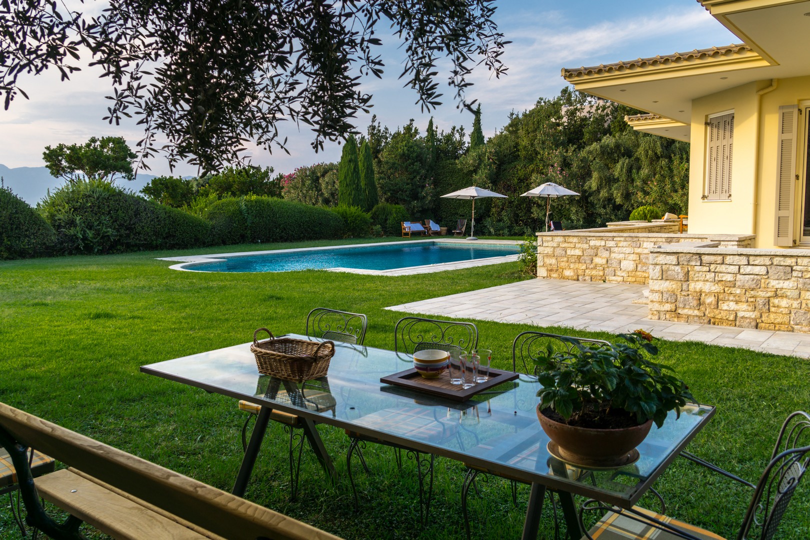 The elevated ground floor consists of slightly different levels and offers 2 master bedrooms, one of them with a fireplace, 2 bathrooms, one of them with Jacuzzi, a WC, 2 fully equipped kitchens, one of which has a traditional wood-fired oven and BBQ, a large living and dining area with a fireplace and one more separate sitting area.