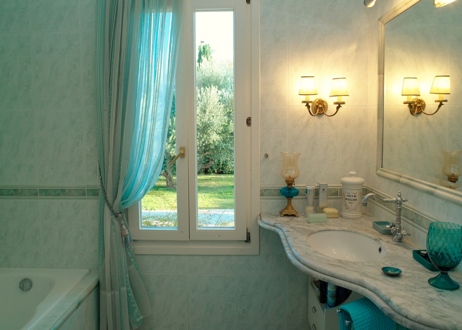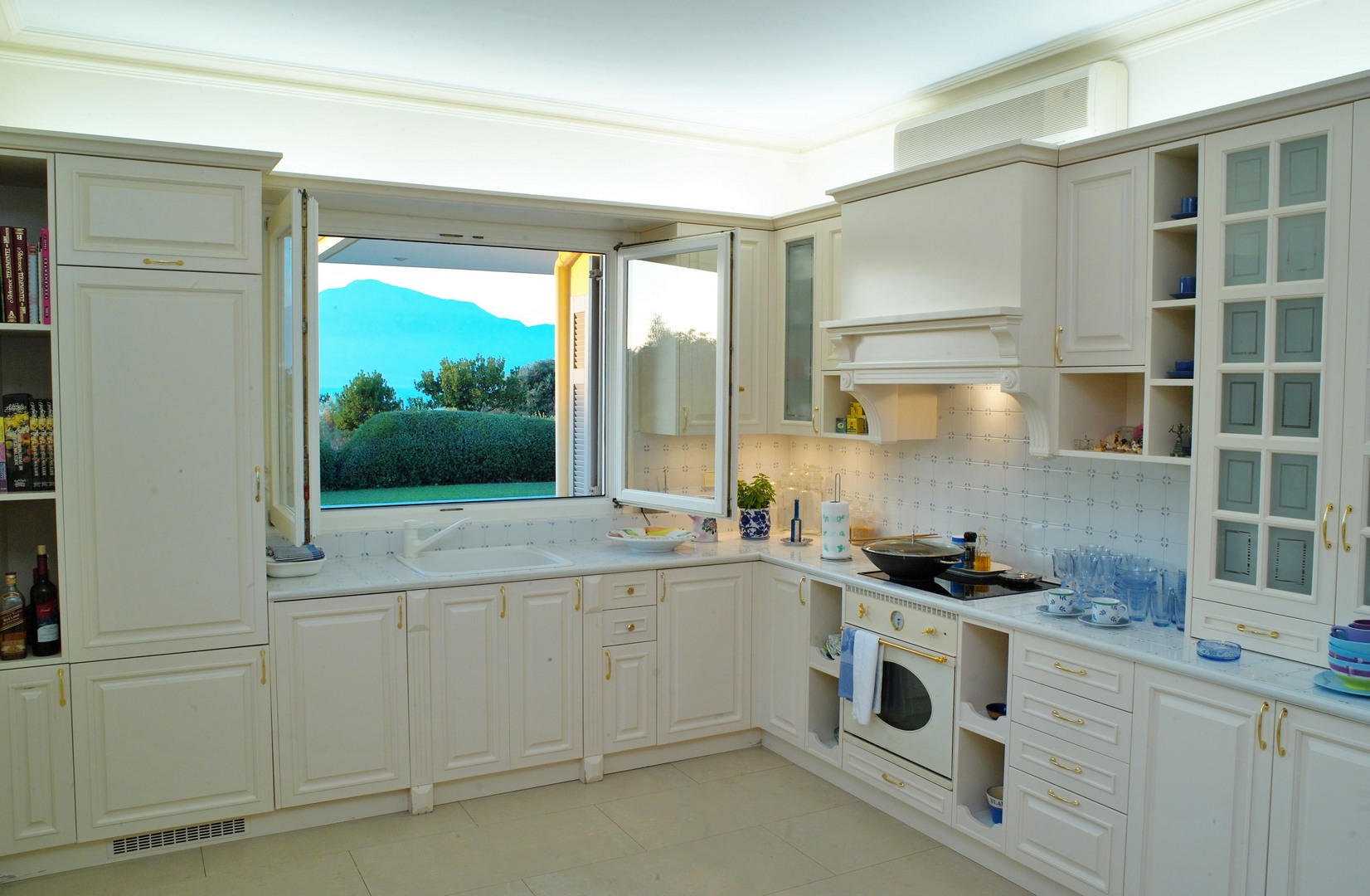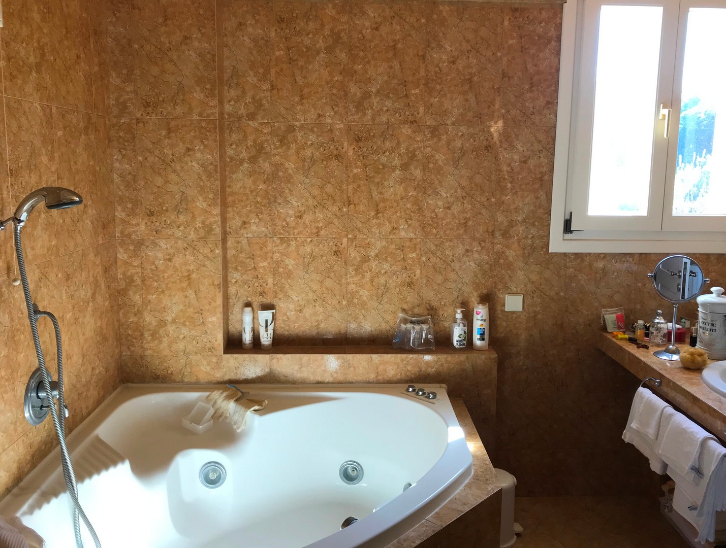 The elevated ground floor consists of slightly different levels and offers 2 master bedrooms, one of them with a fireplace, 2 bathrooms, one of them with Jacuzzi, a WC, 2 fully equipped kitchens, one of which has a traditional wood-fired oven and BBQ, a large living and dining area with a fireplace and one more separate sitting area.