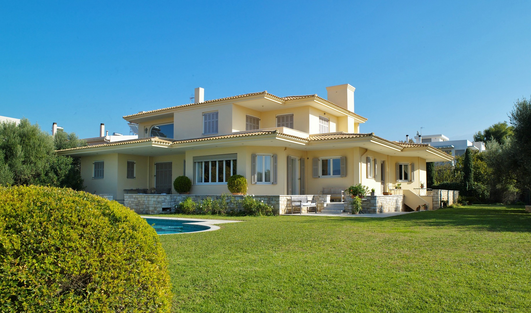 The 489 sq m mansion extends in 3 levels with two different entrances, as there is an option to be used as two independent residencies. The property offers excellent potential for high-yield short-term rentals. Also, there is an additional building capacity of approximately 380 sq.m.