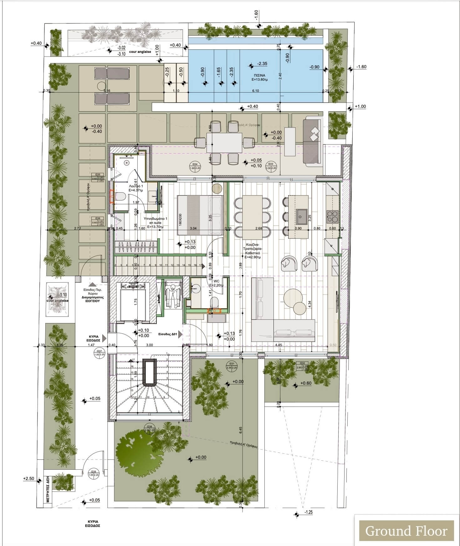Ground Floor (82 sq.m.): This level offers a direct access to a private garden and swimming pool. It features an open-plan kitchen with a dining area, one large bedroom with an ensuite bathroom, and a guest WC.