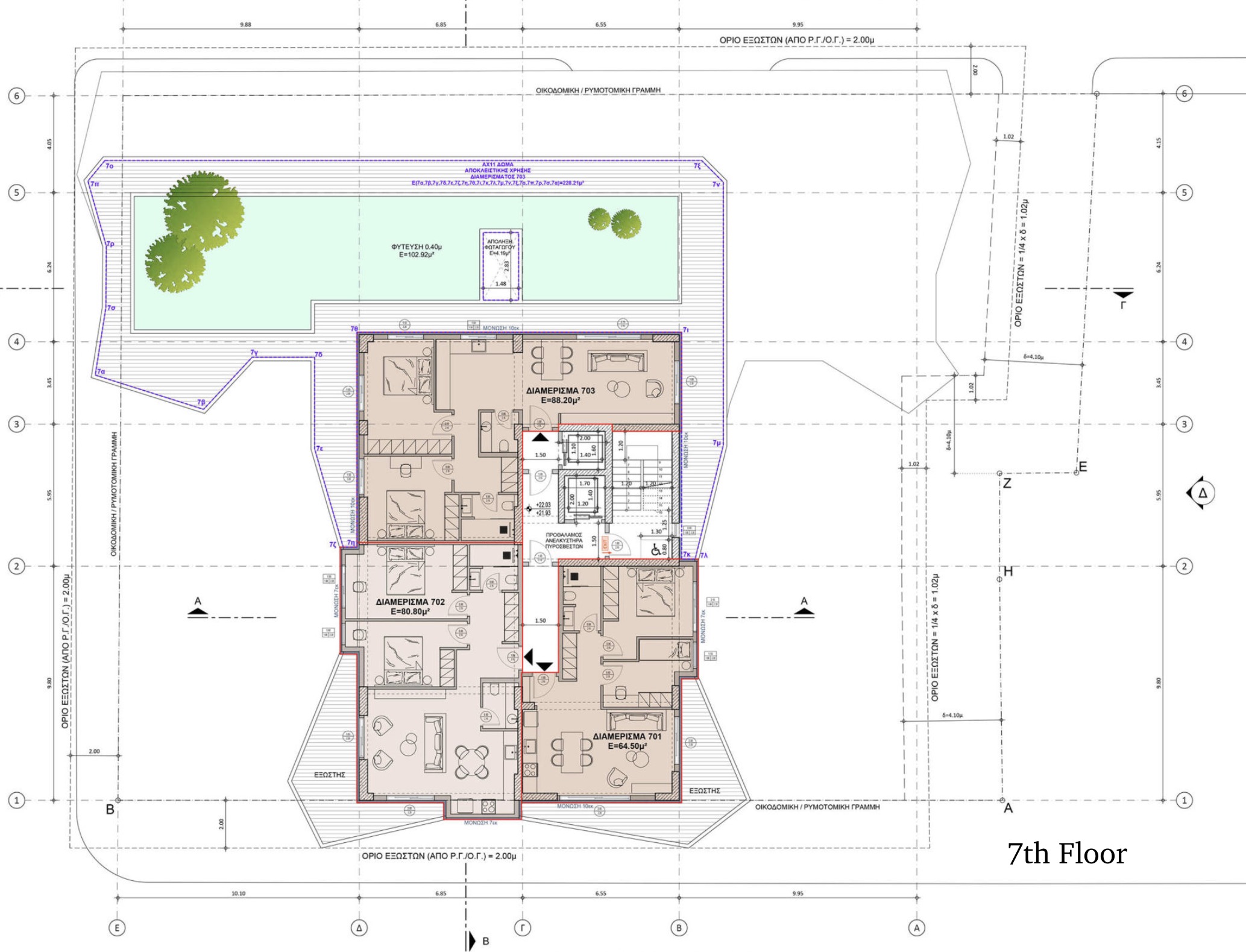 This seventh–floor unit of 88 sq.m area features a three-faced ultra large private terrace of 228 sq.m., offering outdoor lounge areas that provide ultimate privacy and amazing unobstructed open views. This unique apartment layout offers 2 bedrooms, one bathroom, 1 guest WC, a modern kitchen, an open sitting and dining area with high-end finishes and energy-efficient features, ensuring a luxurious yet eco-friendly lifestyle.