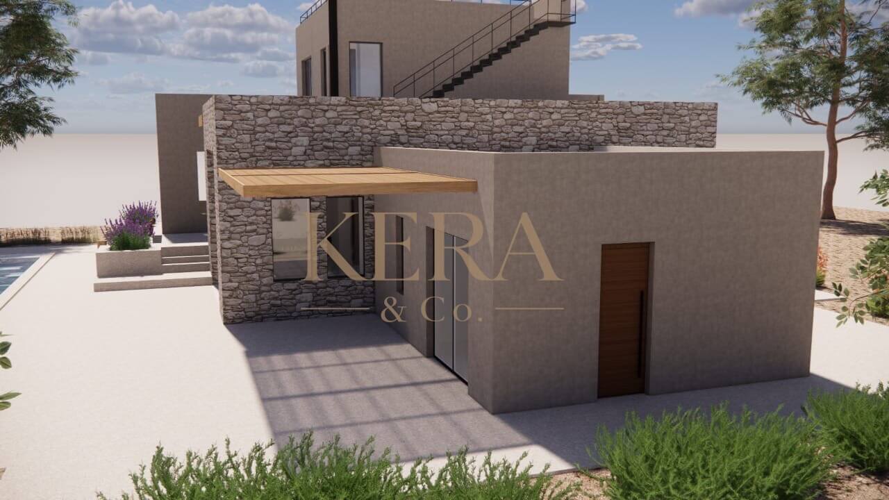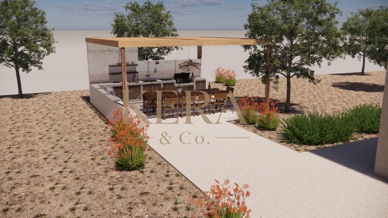 Within a 3.100 sq.m. plot just 200 meters away from the beach, this 190 sq.m. residence under development will extends in 2 levels, featuring 4 bedrooms with en-suite bathrooms, a modern kitchen, one bathroom, a guest W.C. and a large living-room.