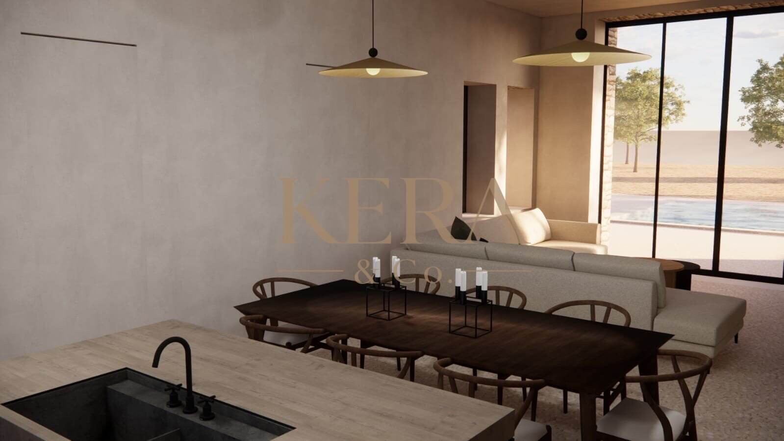 The well-landscaped outdoor area with an olive grove of 85 trees, will feature a swimming pool with a relaxation area, parking spaces and various trees and plants.